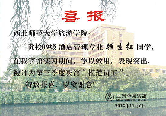 beat365官网2009级的同学已顺利结束了在宁波亚洲华园宾馆的实习。酒店管理2班顾生红同学在实习期间,热爱本职工作,勤奋好学,善于思考,兢兢业业,在师傅及同事、领导的帮助和指导下,很快的掌握了前台接待的业务知识,独立上岗后更是积极主动,自我加压,使自身的工作能力和业务素质很快得到提高,得到了良好锻炼,由于表现突出,被评为亚洲华园宾馆第三季度“模范员工”,在此向顾生红同学表示祝贺,希望广大实习生向她学习,在平凡的实习岗位上充分展示自己的风采,为大学生活留下精彩的回忆。