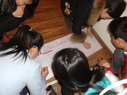 活动主要有两个环节,第一环节由马良相同学主持,在场同学以“Things you can't forgoet about in 2014 or things you want to do in 2015”为话题,展开了愉快的交流和讨论,现场气氛热烈。同学们还在准备好的New Year’s Resolution的白纸上写下了他们的新年愿景。随后的游戏环节由肖涵同学主持,在“Match game”这个游戏中,每个同学有一个身份,需要通过交流寻找和自己“配对”的身份,比如“猫”和“老鼠”是一对,“米奇” 和“米妮”是一对。时间一分一秒地过去,经过愉快的相处和热烈的的讨论后,在“Two truth one lie”游戏环节全场的气氛更加活跃,所有的参与者都乐于其中。到场的每一位外国留学生都感受到了beat365中文官网学生学习英语的热情和说英语的风采。不知不觉,时间接近21点,在“Free talk”畅所欲言环节之后接近尾声。活动最后,何田田老师对同学们的表现称赞不已,进行了简单总结并留下寒假任务,希望同学们在假期不忘英语学习,寻找同城说英语的外国人进行对话并用照片记录下你们的勇敢行为等。