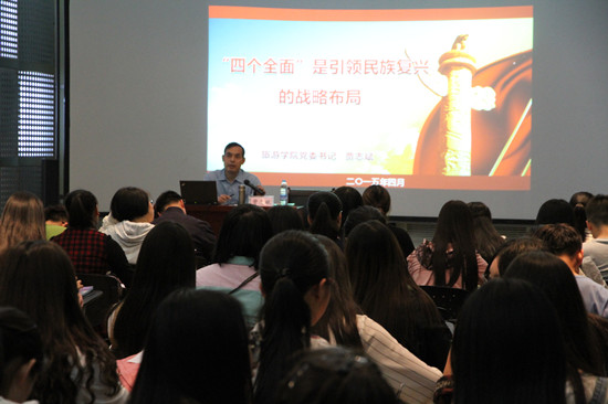 在培训班上,贾志斌书记做了题为“‘四个全面’是引领民族复兴的战略布局”的首场报告。首先,贾书记简单介绍了以习近平为总书记的党中央提出的“四个全面”和“一带一路”建设两个重大战略任务的背景,他指出在2013年9月和10月,中国国家主席习近平在出访中亚和东南亚国家期间,先后提出共建“丝绸之路经济带”和“21世纪海上丝绸之路”即“一带一路”的战略构想,得到国际社会高度关注和有关国家积极响应,随着2015年3月28日国家发改委、外交部、商务部发布《推动共建丝绸之路经济带和21世纪海上丝绸之路的愿景与行动》的发布,“一带一路”建设进入实质性阶段,给我们甘肃转型发展带来了重大发展机遇,希望广大党员和同学给予更多关注。随后,他从“四个全面”提出的背景、基本内容、逻辑关系和本质意义四个方面并着重对“四个全面”的基本内涵和内容进行了详细的解读。他从“两个一百年”、“十八大提出的小康社会的标准(目标)”、“实现两个翻番”及我们甘肃面临小康社会建设的困难等方面对“全面建成小康”社会做出了解析。当讲到全面深化改革时,贾书记介从“为什么要改”、“指导思想”、“总目标”、“改革的重点”、“改革的亮点”等五个方面进行了讲解。随后,贾书记从“历史背景”、“四中全会的新思路”、“司法改革的新亮点”、“意义”四个方面对“全面推进依法治国”给同学们做了全新的引导。接着,贾书记从“我们党的现状”、“从严治党的五个具体措施”两个方面对“全面从严治党”做了讲解。讲到“全面从严治党”时,贾书记结合2013年1月中央政治局会议关于党员发展,中组部、中宣部、教育部党组2013年7月《关于进一步加强高校学生党员发展和教育管理服务工作的若干意见》及中组部2014年6月新修订的《中国共产党发展党员工作细则》等文件精神,给学院入党积极分子提出了一些要求,要求同学们做一个“德才兼备”的大学生,并要端正和树立正确的入党动机,并要求我们的党员和预备党员从严要求自己,针对我校近期开展的“公共卫生间专项治理”工作,希望大家以身作则、积极参与,将学院“公共卫生间治理”工作做好。最后,贾书记对“四个全面”的逻辑关系和本质意义做了简单解读和总结。贾书记的报告近两个小时,内容丰富而精彩,引来同学们热烈的掌声。