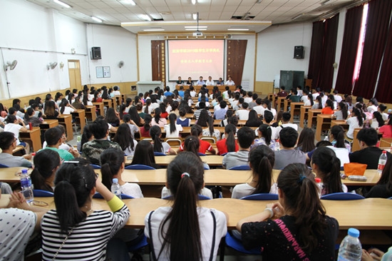 8月27日下午,学院2015级学生开学典礼暨新生入学教育大会在6号楼C区115多媒体报告厅隆重举行。学院党委书记贾志斌副研究员、院长把多勋教授、副院长梁旺兵教授、高亚芳教授、万建斌同志、副书记谢致远副研究员,旅游管理系系主任欧阳正宇博士、酒店管理系副系主任谢民老师、航空服务与管理系系主任柴亚林博士、文化产业管理系系主任王力博士,院办公室主任张建华老师、团委书记王瑞老师、北京广慧金通教育科技有限公司驻西北师大工作处主任张晓雯老师,2015级本科生班主任、辅导员、2015级全体新生及部分家长共300余人参加了本次大会。大会由党委副书记谢致远主持。