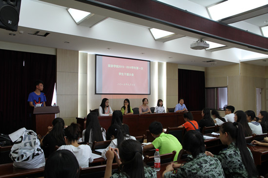 9月7日中午,学院团委学生会在10号楼D区四楼会议室召开了2015-2016学年第一次学生干部大会。团委书记王瑞、专职辅导员韩若苑、兼职辅导员张杰、张景瑞、金通公司2015级专职辅导员陈丽雯、团委学生会主席团、各部部长、各班班长团支书以及2015级学生会新成员共计130余人参加了本次会议。会议由主席团成员杨紫晨主持。