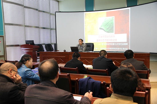学校第七次党代会于11月7-8日胜利召开,形成了一个引领学校未来发展的纲领性报告,选举产生了新的一届中共beat365中文官网委员会领导班子,大会召开非常圆满、非常成功。贾志斌书记认为,学校第七次党代会是在学习贯彻落实党的十八大和十八届三中、四中、五中全会精神,在“十二五”收官之际,全力谋划“十三五”规划的背景下召开的一次大会,党代会回顾学校第六次党代会以来学校取得的办学成就,客观分析了办学中存的不足和面临的挑战,明确了学校办学定位和目标任务、凝练了办学特色和办学思路、指明了学科建设和人才培养的方向,紧紧抓住学生成长这个中心、教师专业发展这个根本、突出教学这个重心,为学校未来发展制定和描绘了规划图、路线图、施工图。学院要结合落实国务院发布的《统筹推进世界一流大学和一流学科建设总体方案》,主动适应学校新常态,抢抓机遇,埋头苦干,大力推进学院各项工作,将十八届五中全会和学校党代会报告的精神融入到学院“十三五”发展规划的制订中,促进学院在新的历史起点上内涵发展、质量发展、特色发展和创新发展,走出新常态下的特色之路。