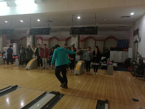 实践活动期间,同学们在工作人员的带领下来到了位于体育馆二楼的保龄球馆。在工作人员的帮助下换上了专门的球鞋,在老师的指导下,四个人一组站在了球道上做好准备。工作人员把打保龄球的技巧简单的向我们做了介绍之后,我们开始了练习。由于我们都是第一次接触保龄球,起初的表现都不尽如人意,后来在老师的指导下,我们都有了很大的进步。整整一小时的练习过程中气氛都很融洽,这次的练习有些累但更多的是欢笑。