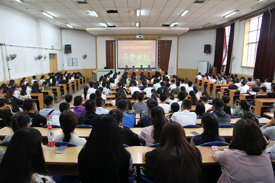 8月25日下午,学院2016级新生开学典礼暨入学教育大会在6号楼报告厅举行。全体院领导、各系主任、办公室主任、团委负责人、2016级新生班班主任及2016级全体新生共240余人参加了大会。大会由党委副书记谢致远主持。
