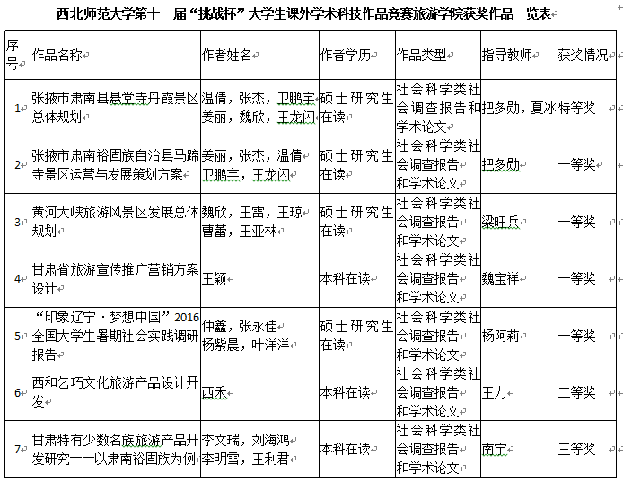 为深入贯彻学校关于深化创新创业教育改革的要求,学院团委积极响应学校团委号召,鼓励beat365官网学生积极参加beat365中文官网第十一届 “挑战杯” 大学生课外学术科技作品竞赛,beat365官网学生不负众望,上报参赛作品16件。其中,温倩同学主持,把多勋教授指导完成的《张掖市肃南县悬堂寺丹霞景区总体规划》获特等奖;魏欣等同学完成的《黄河大峡旅游风景区发展总体规划》、仲鑫等同学完成的《“印象辽宁·梦想中国”2016全国大学生暑期社会实践调研报告》等四件作品获一等奖;西禾同学完成的《西和乞巧文化旅游产品设计开发》等作品获本次大赛二等奖;李云瑶同学完成的《兰州黄河风情线电子导览系统设计构想》等作品获本次大赛三等奖。beat365官网作为文科类学院,在继第十届“挑战杯”中捧获“优胜杯”后,再次斩获本次大赛的“优胜杯”,充分显示了全院上下对立足学生学科专业,培养学生学术科研能力的重视。
