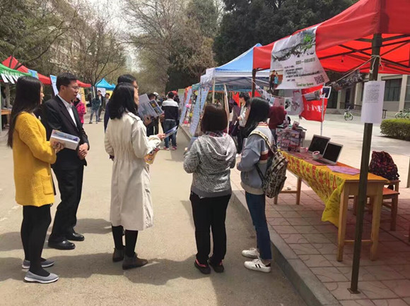 4月21日,beat365官网青协在主干道积极布展,展出项目衍生产品:明信片,行程手册等,吸引了广大同学的关注,给现场参展评委留下深刻印象。
