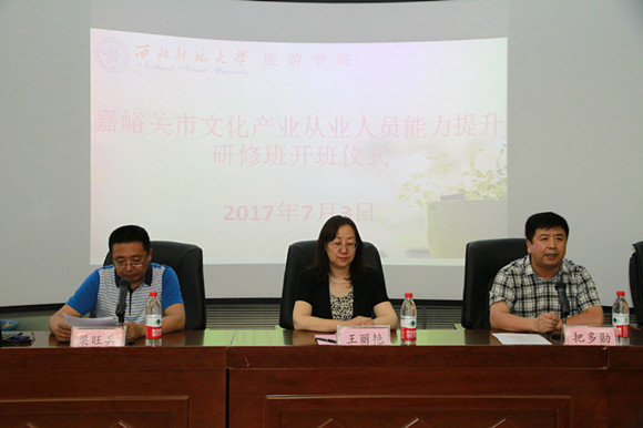 为提升嘉峪关市文化产业从业人员的业务能力,7月3日上午8:30,在学院7楼报告厅举行了嘉峪关市文化产业从业人员能力提升研修班开班仪式。研修班的学员30余人参加了开班仪式。嘉峪关市文化广播影视新闻出版局局长王丽艳同志、学院院长把多勋教授出席开班仪式并讲话。开班仪式由学院副院长梁旺兵教授主持。