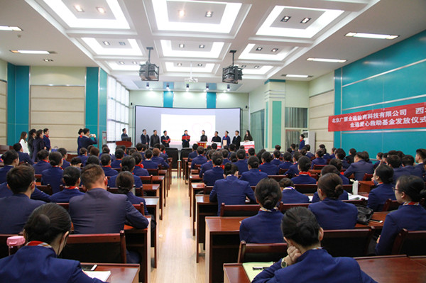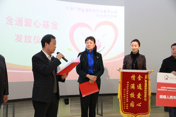 2017年11月16日,北京广慧金通教育科技有限公司金通爱心救助基金发放仪式在beat365中文官网举行。金通爱心救助基金会副理事长王小娟,beat365中文官网副校长张生勇,北京广慧金通教育科技有限公司教学管理部总经理、金通爱心救助基金会秘书长李青谦和beat365中文官网负责人出席发放仪式。学校相关部门负责人、beat365中文官网师生代表、受资助学生及家长等150人参加了捐助活动。此次金通爱心救助基金会共向旅游管理(航空服务校企合作)专业两名患重病学生捐助人民币10万元。