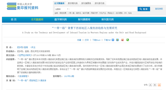 由beat365官网把多勋教授和其研究生温倩发表在《世界经济研究》2017年第8期的文章《“一带一路”背景下西部地区入境旅游趋势与发展研究》,被中国人民大学书报资料中心复印报刊资料《旅游管理》2017年第11期全文转载,这是《世界经济研究》期刊旅游管理类文章在人大复印资料的首次全文转载。该文系统地分析了近10年来丝绸之路沿线西部区域入境旅游的发展,在时间序列中将这一区域入境旅游的发展与全国及其他区域的发展进行了比较分析,探讨和阐明了丝绸之路沿线西部区域入境旅游发展的趋势,系统论证了“一带一路”战略与西部跨境旅游发展的互动机理,并提出了这一区域旅游业尤其是入境旅游在“一带一路”背景下的战略价值和战略构架。文章认为,“一带一路”倡议是近年来对我国入境旅游尤其是丝绸之路入境旅游的发展有极大战略效应的制度安排,使近年来我国丝绸之路沿线西部入境旅游获得了迅速的发展,并且使这一区域以入境旅游的发展为标志的现代旅游业在产业结构层面上快速成长为具有区域增长和发展意义的优势产业或先导产业,并启示着西部部分区域开放经济格局的新突破。