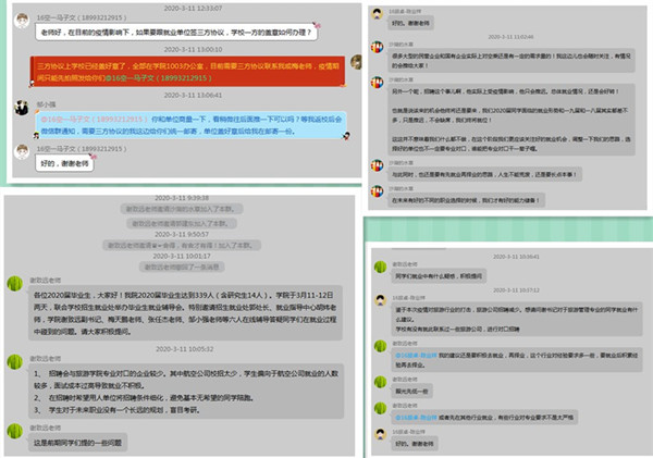 招生就业处相关领导、就业指导中心专职老师,学院分管学生工作领导、毕业班班主任、专职辅导员,充分利用QQ、微信等网络平台,在线对毕业生在就业过程中遇到的问题一一进行了解答。对于很多单位因疫情影响招聘计划延期,部分学生表现出的焦躁情绪,老师们耐心劝导,鼓励同学们积极调整心态,树立信心,共渡难关。同时要把握学校和各地举办的各类网络招聘机会,积极制作和在线投递简历,积极参加在线面试。