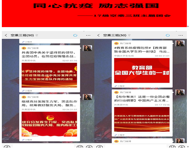 “党旗所指,就是团旗所向”,2017级空乘一班团支部通过主题团日活动组织团员青年深入学习习近平总书记关于爱国主义的重要论述和关于疫情防控工作的相关论述,同学们都积极响应,众志成城,坚决打赢疫情防控阻击战。