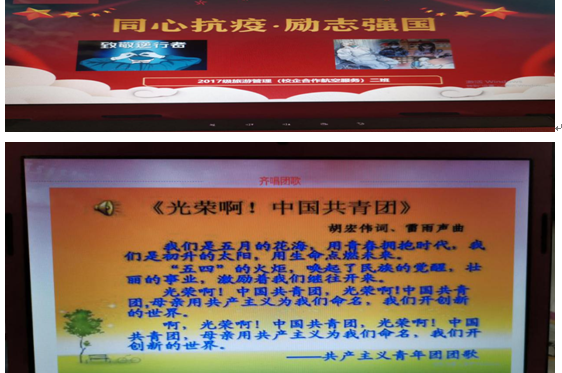 2017级旅游管理班团支部在团支部书记的精心安排下,积极响应学院团委的号召,通过观看专题PPT,观看短视频《战疫》,疫情防控知识竞赛,演讲等形式展开。