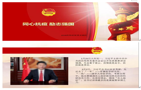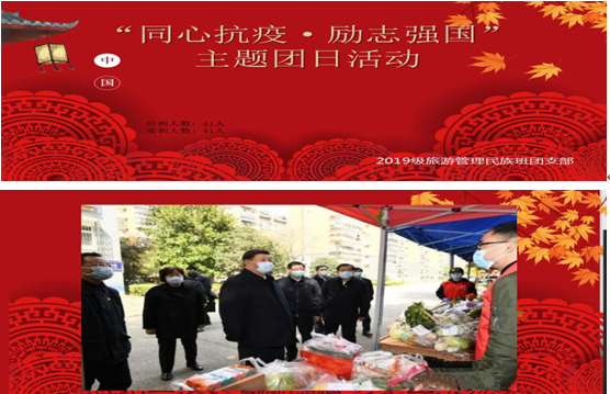 2018级旅民班的团支书则贴心准备了防疫小讲堂,向同学们科普防疫知识,如病毒的原理、正确的洗手方式、个人防护、消毒方法等。同学们也积极分享自己身边的防疫情况和具体措施。更通过观看战疫视频、集体青年大学习等形式进行理论武装。
