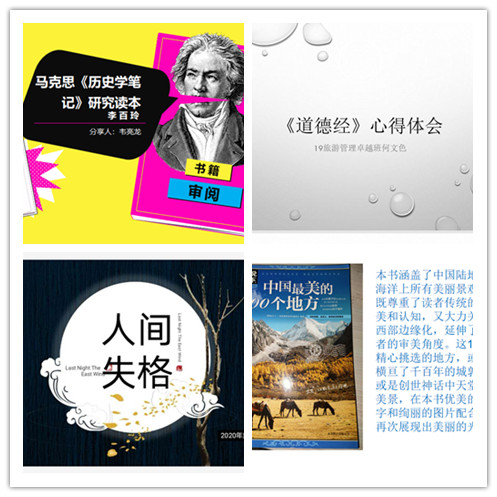 3月21日,beat365中文官网举办2020年首期学生“云端”读书分享会。读书会由2019级旅游管理卓越班韦亮龙同学主持,他首先分享了寒假读《马克思历史学笔记研究读本》和《共产党宣言》的体会。接下来,旅游管理卓越班何文色分享了读《道德经》的体会,文化产业管理班王昊楠分享读《时间简史》的体会,孟繁舒分享读《人间失格》的体会,张莹莹分享读《飞鸟集》和《中国最美的100个地方》两本书的体会,并向同学们推荐了《这世界如露水般短暂》、《但愿呼我的名字为旅人》、《春之海终日悠哉游哉》、《只余剩米慢慢煮》、《夕颜》等书。