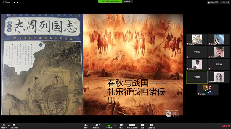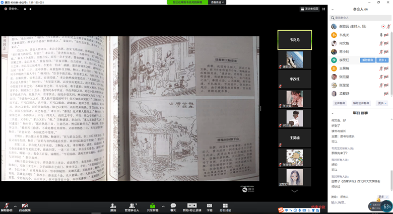 旅游管理卓越班的张欣星同学讲述了她通过阅读《文化苦旅》从而更深入地了解了旅游,谈到大学生应该多读书,既是“腹有诗书气自华”,又因为读书能让我们更宽容地看待世界。其他同学对此也表示感同身受。随后,张莹莹同学也讲述了自己的读书经历,从小学的儿童读物,到中学时的中国古典文学,再到大学时的社会科学、自然科学类读物。鼓励大家多接触中国古典文学作品,理解古人的智慧。并谈到读书也要挑战自我,读能挑战自我的书,让读书开阔自己的眼界。同学们都就此话题在文字聊天区展开了热烈讨论。