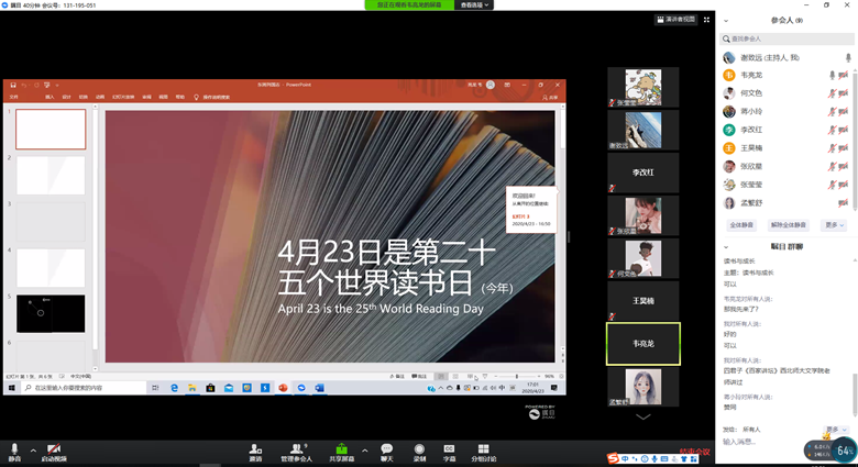 2020年4月23日,是第二十五个世界读书日,是全世界读书人共度的节日。春暖花开日,正是读书时。在这特殊时期,在书香芳菲的四月,学院举办二〇二〇年第三期读书分享会。学子相聚云端,浸润书香,“悦”读世界。