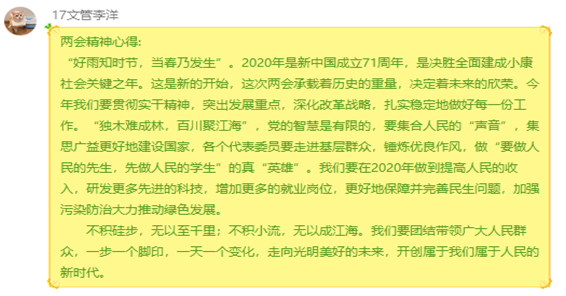 会后,每位同志都就本次会议发表了学习心得。李洋同志说:“不积硅步,无以至千里;不积小流,无以成江海。我们要团结带领广大人民群众,一步一个脚印,一天一个变化,走向光明美好的未来,开创属于我们属于人民的新时代。”怡萌萌同志说:“只要直面挑战,坚定发展信心,增强发展动力,维护好并抓住我国发展重要战略机遇期,当前的难关一定能闯过,中国的发展必将充满希望。”王玉慧同志说:“人民的声音就是时代的声音,人民对美好生活的向往就是我们的目标。我们从人民中来,必须做到一切为了人民,一切造福人民。从全国两会不断传来的“好声音”中,人民的声音最是动听。”