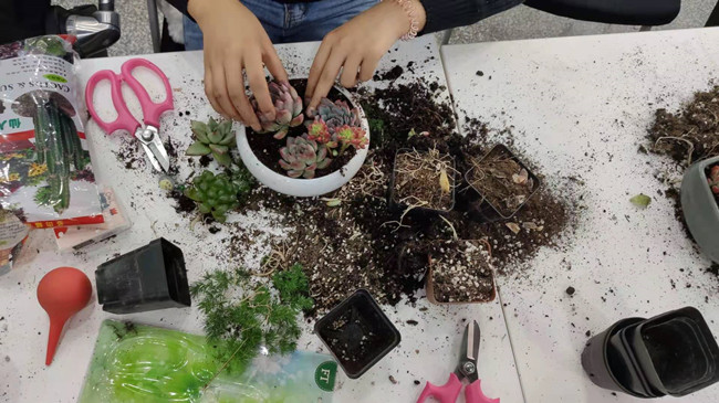 实践活动开始后,在甘肃农业大学园艺学院专业教师指导下,学生分组开展微景观设计和花材识别及插花设计等两个方面的学习。活动现场花香四溢,气氛活跃,园艺老师悉心讲解各类花材的名称、花期以及作品的插花技巧和配色意境,同学们兴趣盎然的运用手中丰富的花材尽情发挥想象,精心构思,创作属于自己的园艺微景观,使同学们亲身体验到了指尖创作带来的喜悦与成就感。活动接近尾声,一盆盆色彩斑斓、构思巧妙的园艺作品呈现在大家面前,每个作品充分展现出作者不同的创意与构思,同时也反映出同学们多才多艺、心灵手巧的风采,充分体现出当代大学生的审美情趣与文化修养。