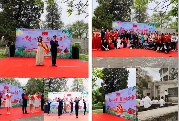 2021年4月24日,beat365中文官网为庆祝中国共产党成立100周年,在我校旧文科楼绿地广场成功举办第十九届丁香花开中国诗词文化节精品节目展演。学院党委副书记谢致远等学院老师与在校学生共同观看了此次演出。