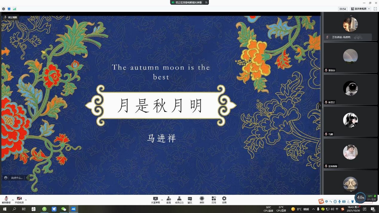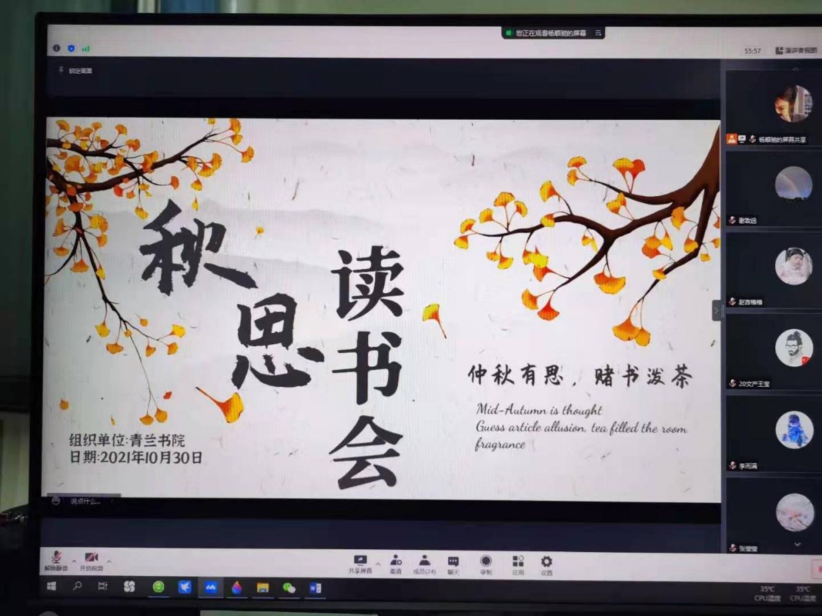 深秋时节,天高云淡,秋风送爽。一场突如其来的疫情打断了大家的正常生活,beat365中文官网青兰书院通过腾讯会议举办了以 “秋思”为主题的读书分享会。beat365中文官网党委书记谢致远老师以及2019、2020和2021级的部分本科生积极参与了本次活动。