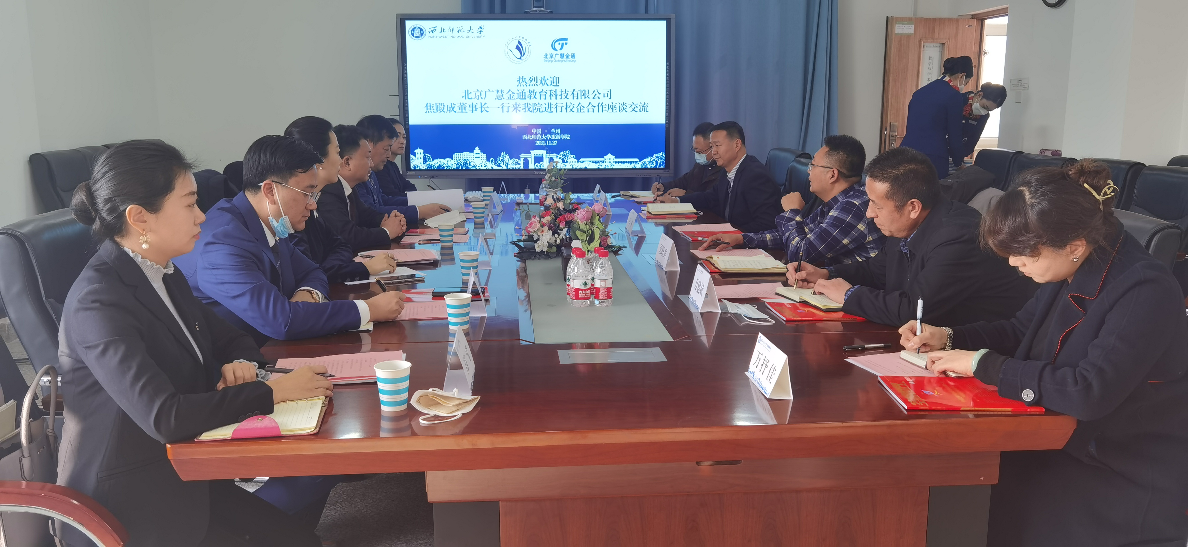 11月27日,北京广慧金通教育科技有限公司董事长焦殿成、副总经理付晓军、李青谦一行来beat365官网进行考察交流,校纪委书记马庆、学院党委书记谢致远、院长梁旺兵、副院长万建斌、柴亚林,学院党委副书记戴小武,航空服务与管理系副主任万抒佳,北京广慧金通教育科技有限公司驻beat365中文官网工作处主任席聪等人参加了座谈会。