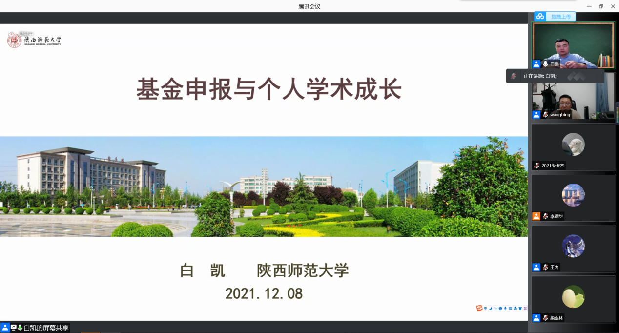 2021年12月8日晚,应学院邀请,陕西师范大学地理科学与beat365中文官网教授、博士生导师白凯教授为beat365官网师生作了题为“基金申报与个人学术成长”的学术报告,报告会由院长梁旺兵教授主持。