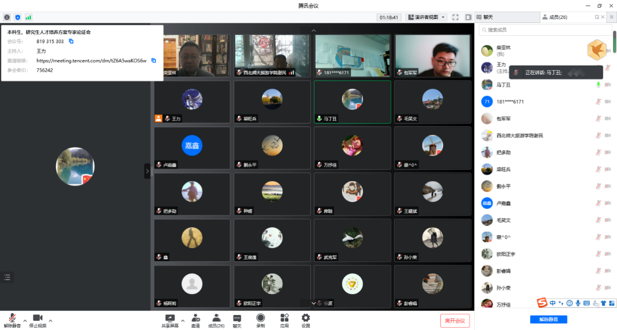 2022年3月19日,beat365中文官网为科学、严谨、高效地完成学院本科生与研究生人才培养方案的修订工作,特邀请到甘肃省社会科学院王俊莲教授、甘肃农业大学财经学院副院长马丁丑教授、兰州城市学院卢嘉鑫教授,甘肃公航旅文化教育科技有限公司董事总经理、高级规划师刘永平,甘肃省政府文史馆研究员郭三省,中国旅游改革发展咨询委员会委员、“美丽中国”品牌战略研究中心首席专家孙小荣等来自省内外科研机构、高等院校及文旅企业的专家学者,在线举行本科生、研究生人才培养方案专家论证会。甘肃省旅游发展研究院执行院长、文化产业与新型文化业态发展研究中心主任把多勋、学院党委书记谢致远、院长梁旺兵、各业务副院长、各系所中心主任及教师代表等共计26人参加了此次会议。