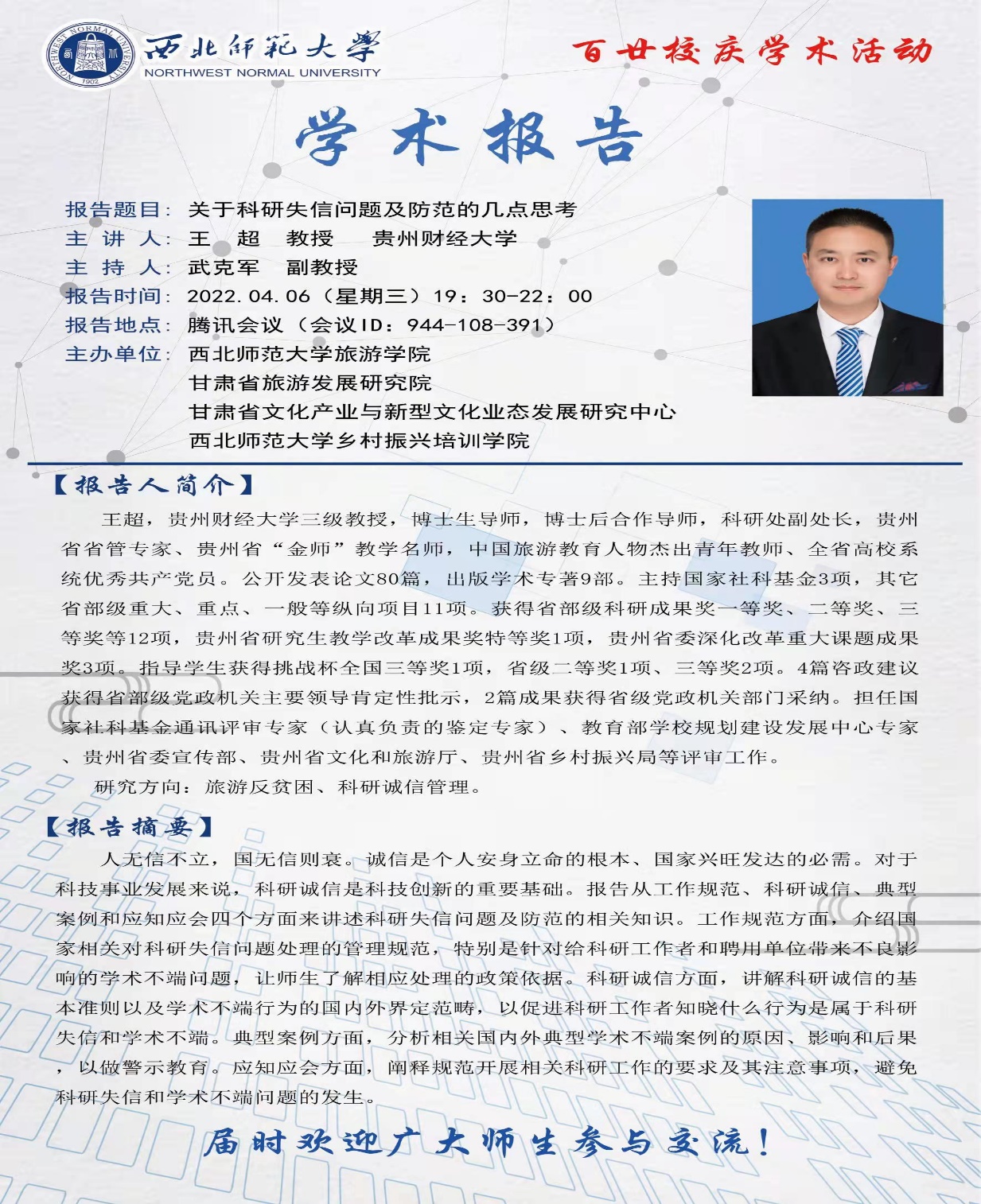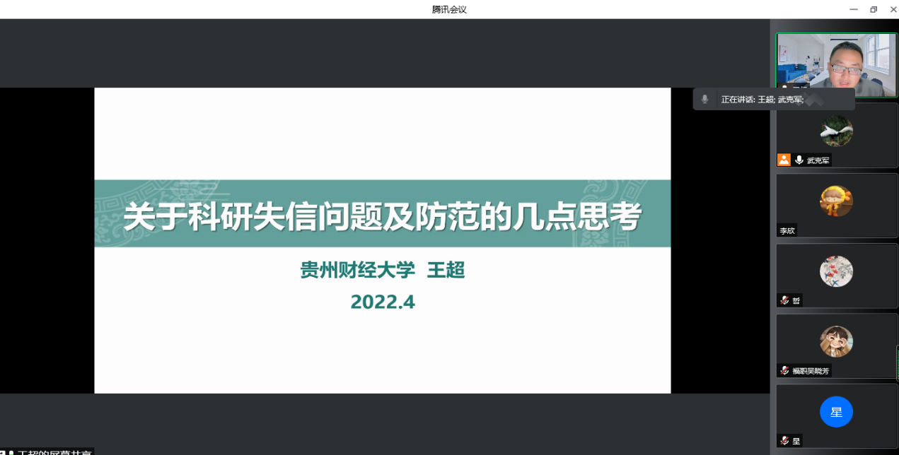 2022年4月6日晚上,应学院邀请,贵州财经大学三级教授、博士生导师、科研处副处长王超教授为beat365官网师生作了题为“关于科研失信问题及防范的几点思考”的学术报告,报告由武克军副院长主持,学院师生约165人参加了报告会。
