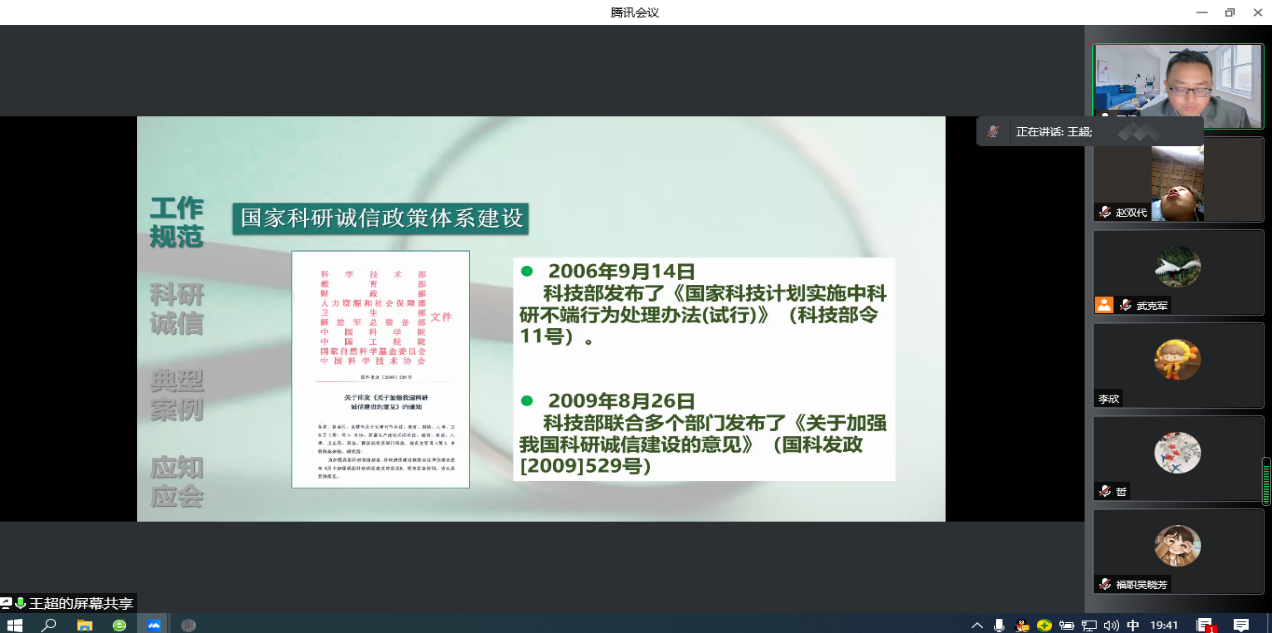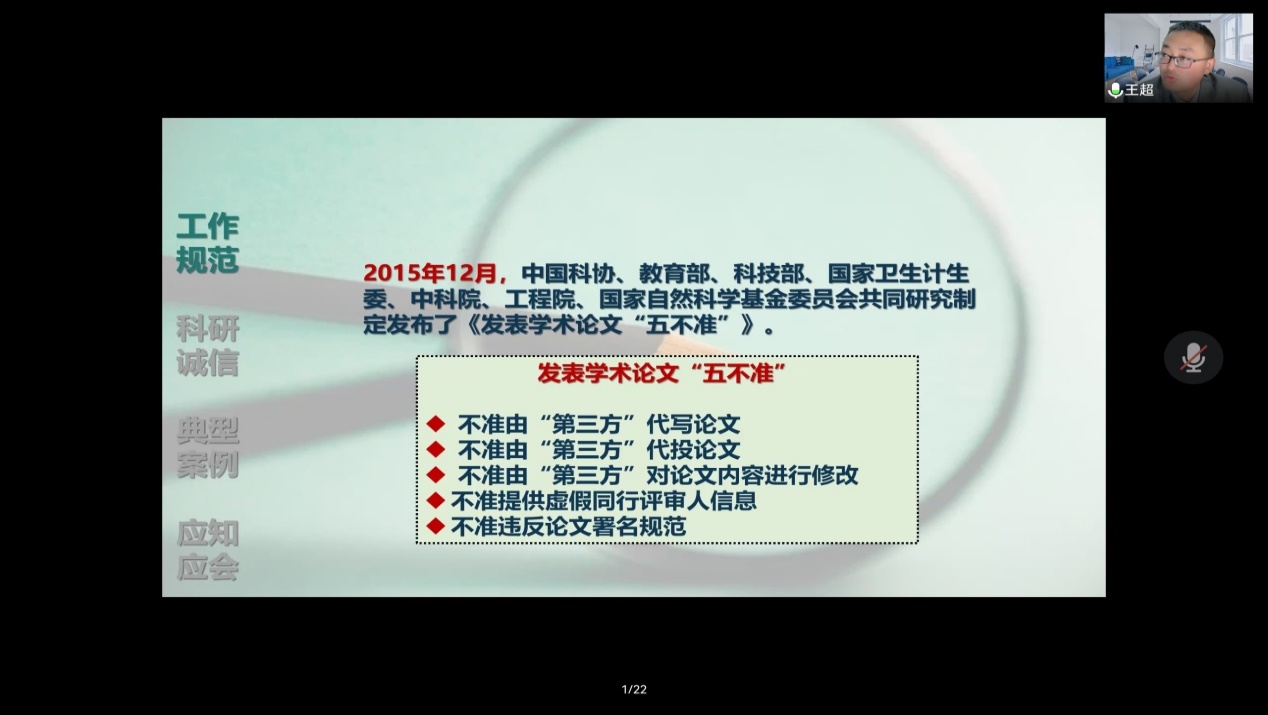报告会上,王超教授从工作规范、科研诚信、典型案例和应知应会四个方面展开自己的讲解。工作规范方面,王超教授介绍了我国最近几年发布的各种规章制度以及国家对于科研失信问题处理的管理规范,让学生们能够根据政策处理相关的问题。科研诚信方面,王超教授从中国科协公布的科技工作者调查报告出发,讲解了科研诚信的基本准则和国内外对于学术不端行为的界定范畴,区别了科研失信和学术不端。典型案例方面,王超教授通过分析国内外学术不端的典型案例,给学生和老师做了警示教育。应知应会方面,王超教授细致分析了学术规范等相关工作,包括基本准则、查新和项目申请规范、项目实施规范、论文发表规范、论文发表后续工作规范以及人及试验动物研究对象规范,阐释了规范开展相关工作的要求和注意事项。
