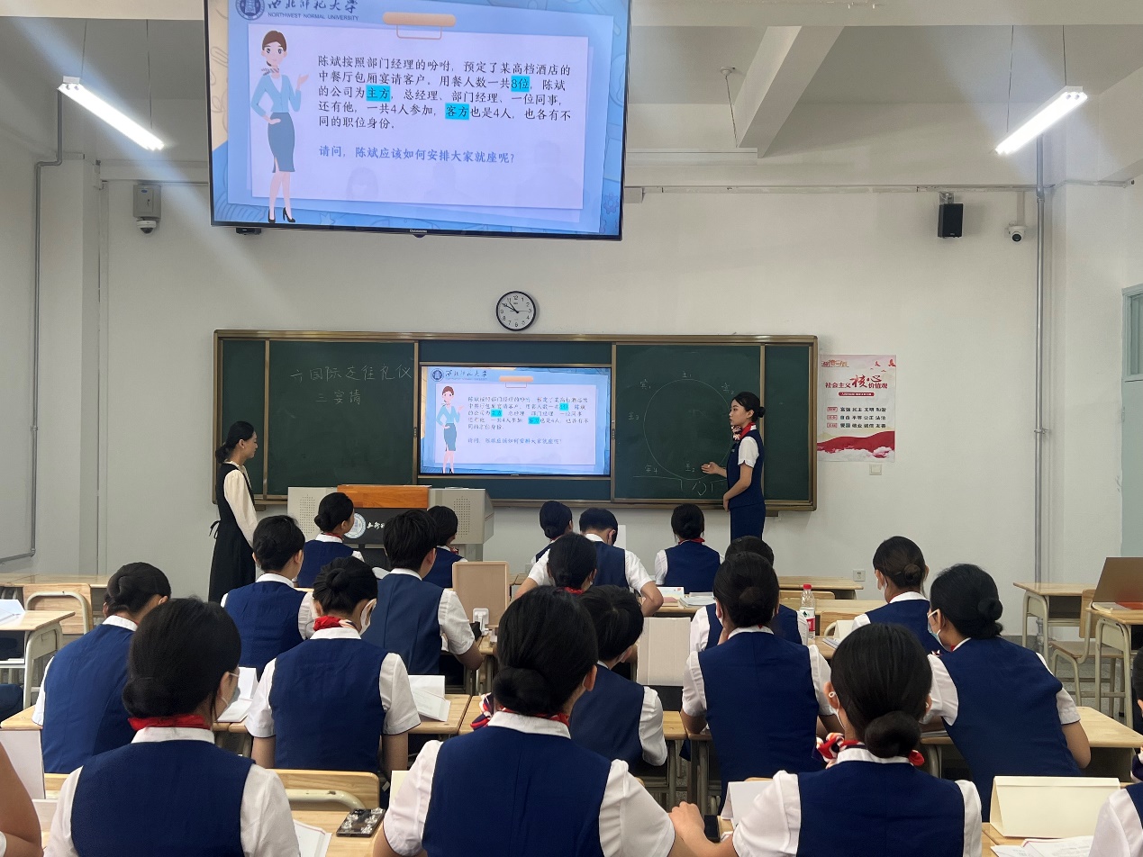 殷玥老师的这堂课程围绕宴会礼仪的相关知识与实际演练展开,通过基本概念的讲解,使学生了解并掌握中西方宴会举办的基本类型、方式、环节与座席安排原则,重点培养学生针对大型正式宴会的组织管理与团队协作和沟通能力。殷老师在授课过程中将多媒体课件与板书有机结合,把相关知识直观而简洁地呈现给学生。课堂上,90后的殷玥老师展现出扎实的教学基本功,教态从容自然、沉稳老练,语言吐字清晰、速度适中,讲授思路缜密、娓娓道来,引导学生逐一完成教学目标。