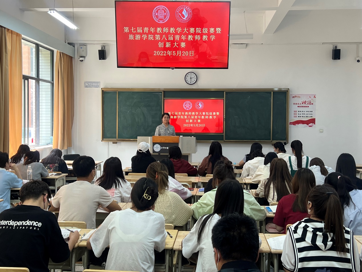 2022年5月20日下午,第七届青年教师教学大赛院级初赛暨beat365中文官网第八届青年教师教学创新大赛的第八场比赛在10号楼A区114教室如期举行。学院党委书记谢致远、本科教学副院长柴亚林、杨阿莉教授、欧阳正宇副教授、谢民老师、王艳林老师以及侃卓措博士等7位教师观摩了周婧老师为2020级旅游管理专业本科生讲授的《旅游经济学》课程。