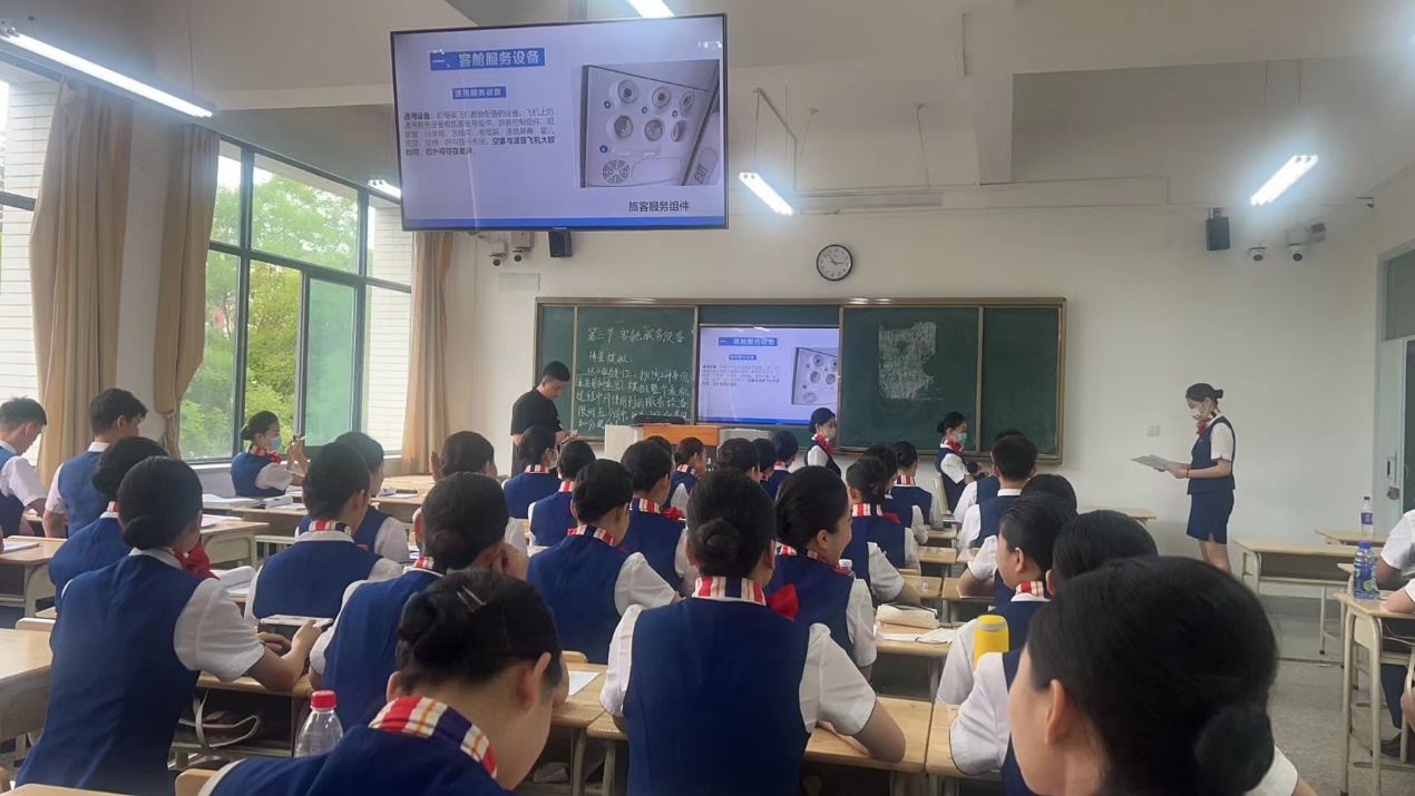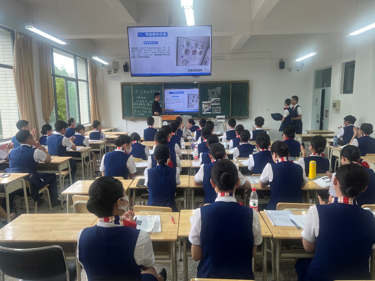 宋泽老师对该课堂内容进行精细设计,旨在强化学生的实际操作能力,通过对民航客舱设备配置、结构、功能的讲解与阐述,使学生将民航客舱服务技能与设备运用能力深入融合,在分组演练过程中完成处置能力与管理能力的双提升。课堂上,初登讲台不久的宋泽老师表现得成熟自信,授课时情绪饱满、态度亲和,语言表达简洁流畅,理论阐释深入浅出,示范操作精准流畅。