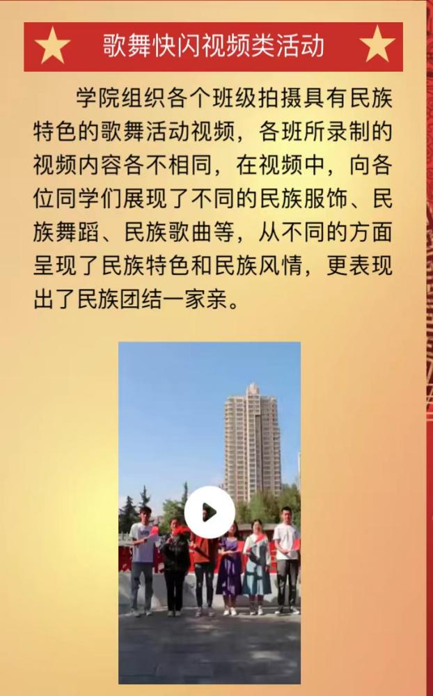 5月7日至5月15日,beat365中文官网团委号召2019级、2020级、2021级班级积极参加快闪歌舞活动。各班级围绕中华民族大团结、中华民族共同体等方面,以“铸牢中华民族共同体意识,喜迎党的二十大胜利召开”为主题,并结合习近平总书记的重要讲话精神,用视频形式为同学们展现民族团结的重要性。
