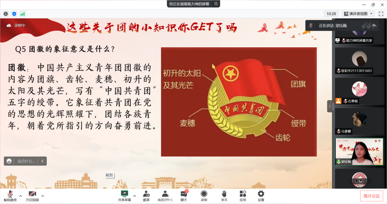 此次活动特别推出“百年团团你知道”共青团知识宣讲环节。通过介绍共青团的性质、深入解读团旗和团徽的含义以及共青团的四项基本职能等知识,深化广大青年对中国共产主义青年团的认知,充分发挥暑期社会实践活动的育人作用。活动还特邀在兰州抗击新冠肺炎疫情中争当志愿者的两位同学分享了他们的抗疫故事。受此感染,许多参会同学也纷纷打开麦克风讲事迹、谈感悟,用激昂的言语诠释着共青团员应有奉献与担当。