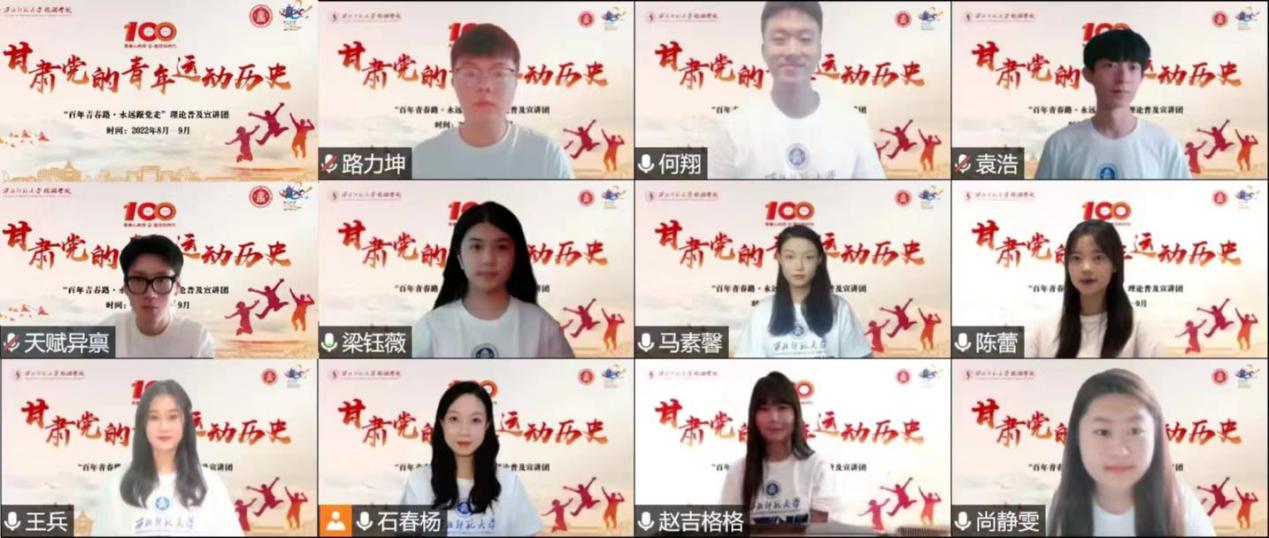 为庆祝中国共产主义青年团成立100周年,筑牢青年理想信念之基、汲取智慧力量、强化使命担当、传承红色基因,引导青年学生实践出真知、实践长真才。2022年9月1日beat365中文官网beat365中文官网“百年青春路·永远跟党走”理论普及宣讲团,通过云端,为beat365中文官网生命科学学院、地理与环境科学学院、外国语学院、数学与统计学院、传媒学院、beat365中文官网与甘南藏族自治州卓尼县柳林中学的三百多名团员青年学生进行甘肃党的青年运动历史宣讲和中国共产主义青年团知识普及实践活动。