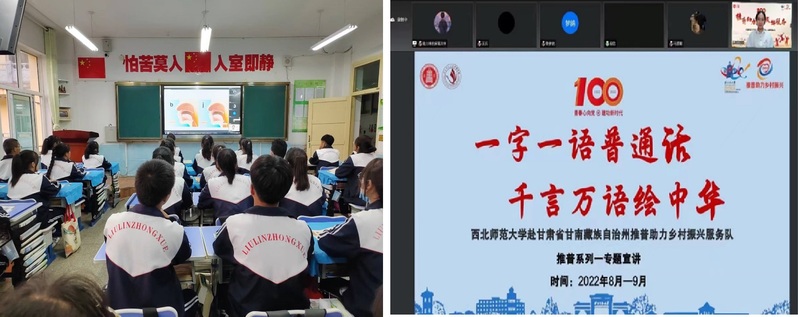 8月28日,实践团队通过线上云宣讲的方式为甘南藏族自治州卓尼县柳林中学的高中学生开展《一字一语普通话·千言万语绘中华》推广普通话专题宣讲,宣讲团成员石春杨同学针对气息训练、发音训练、字词断句等方面准备了特色课程。通过典型示范,与同学们在线上面对面互动诵读,并针对发音中容易出现的错误问题进行简要分析,给予同学们正确的示范反馈,对于同学们今后讲好普通话具有良好的教学示范作用。