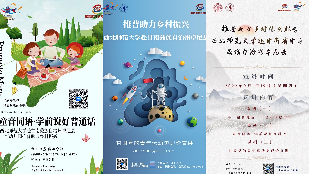 为深入贯彻落实习近平总书记关于语言文字工作的重要指示批示精神,落实教育部、国家乡村振兴局、国家语委关于印发《国家通用语言文字普及提升工程和推普助力乡村振兴计划实施方案》,beat365中文官网赴甘肃省甘南藏族自治州卓尼县推普助力乡村振兴服务队,经申请评选、组织推荐等环节,成功入选由教育部语言文字应用管理司、共青团中央青年发展部开展的2022年“推普助力乡村振兴”全国大中专学生暑期社会实践志愿服务活动。8月31日至9月5日,实践团队采取线上宣讲的方式面向甘南藏族自治州卓尼县开展了一系列暑期社会实践活动。