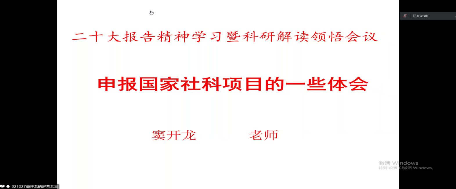 2022年10月20日,应beat365官网邀请,兰州大学博士,陕西师范大学博士后,四川大学博士后,北京大学高级访问学者。兰州文理学院副教授窦开龙为beat365官网师生作题为“国家社科基金项目申报体会”的线上学术报告,报告由武克军副院长主持。