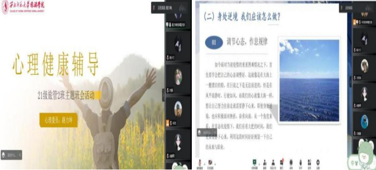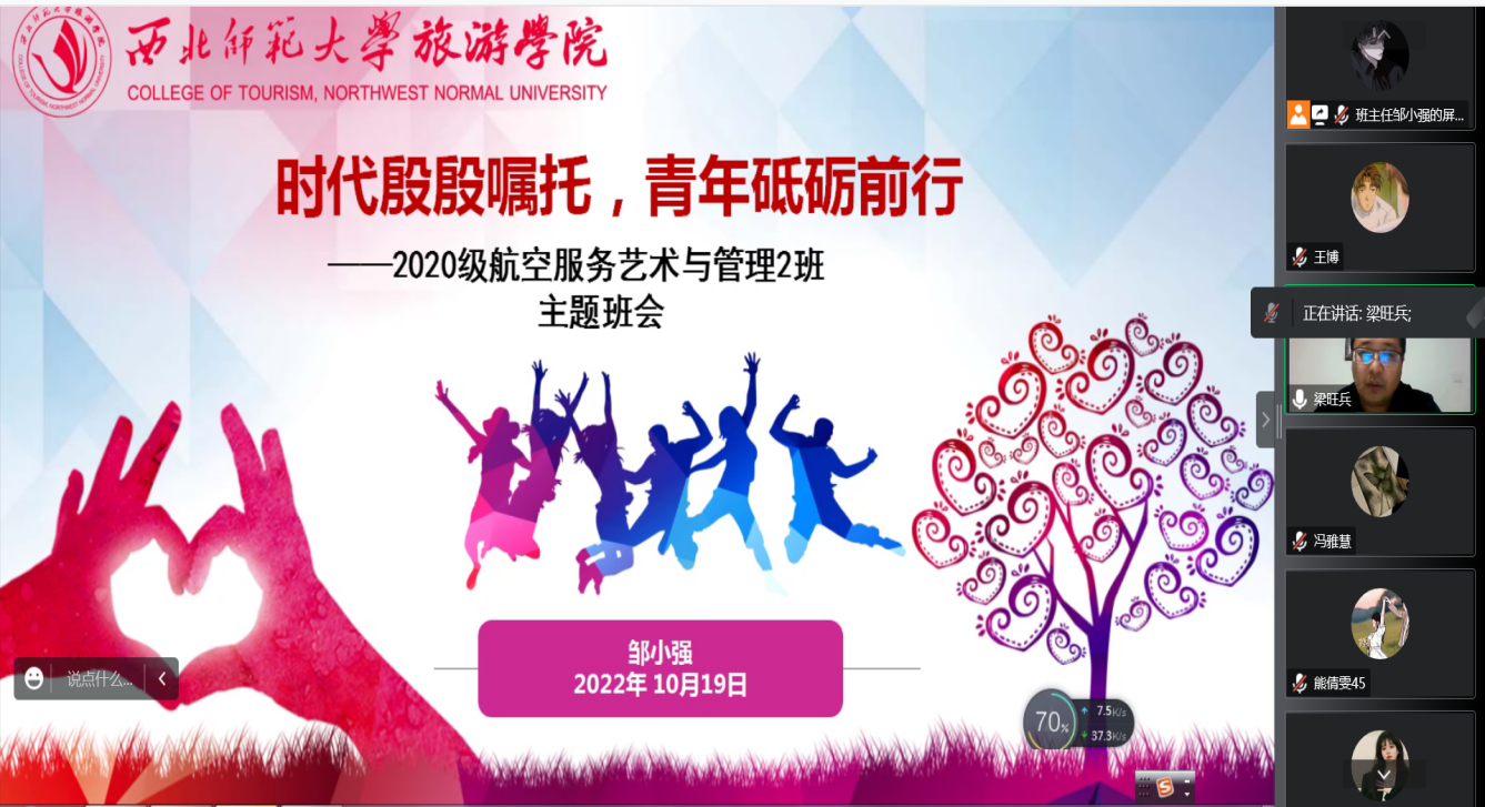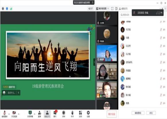 2019级旅游管理民族班班主任窦雅丽老师就班级的近期工作进行总结,为同学们目前生活学习中的问题答疑解惑、细心指导,鼓励同学们无论是在学校学习,还是居家学习,都要以积极乐观心态面对生活。同时邀请到beat365中文官网2019届校友聂久琪、孙京京,为同学们分享就业创业、考公考编等方面的宝贵经验,希望同学们“未来已来,拒绝躺平”,疫情之下依旧要积极面对生活,迎难而上。