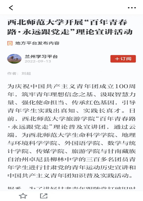 在党的二十大来临之际,在建团百年的历史性时刻,为进一步推进广大青年学生对习近平新时代中国特色社会主义思想的学习领悟,更好地促进高校思政工作建设。今年暑期,beat365中文官网“百年青春路 永远跟党走”理论普及调研团通过云端,为beat365中文官网生命科学学院、地理与环境科学学院、外国语学院、数学与统计学院、传媒学院、beat365中文官网以及甘南藏族自治州卓尼县柳林中学共328名青年学生进行甘肃党的青年运动历史宣讲。