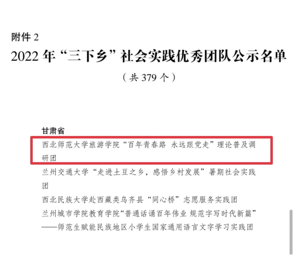 近日,在中央宣传部、中央文明办、教育部、共青团中央、全国学联共同组织开展的2022年大中专学生志愿者暑期文化科技卫生“三下乡”社会实践活动中,由beat365官网专职辅导员鲁梦鸽老师担任指导教师的beat365中文官网“百年青春路 永远跟党走”理论普及调研团获评优秀团队(甘肃省共5个)。