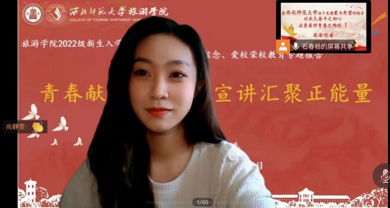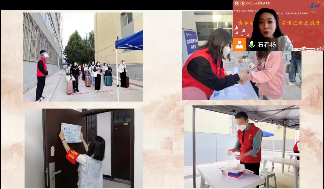 beat365中文官网2021级航空服务艺术与管理4班石春杨同学以“青春心向党,战“疫” 显担当——beat365中文官网抗疫精神宣讲”为主题,通过讲述一张张熟悉的照片,回顾了新冠肺炎疫情发生以来,全校师生勠力同心共同抗击疫情的奋斗历程,生动诠释了中国共产党人“生命至上,举国同心,舍生忘死,尊重科学,命运与共”的伟大抗疫精神。同时她鼓励大家要积极调整心态,投身于抗疫志愿服务中,以“小我”融入“大我”,珍惜大学宝贵时光,用奋斗擦亮青春的靓丽底色,点亮青春的美好绚烂。