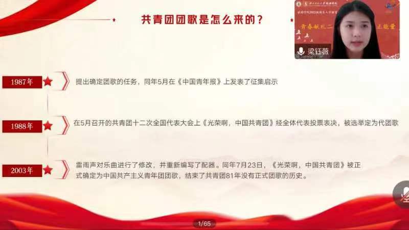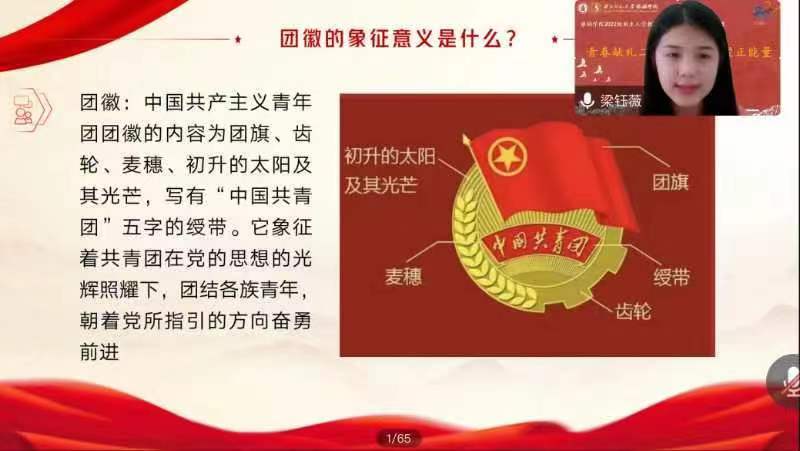 beat365中文官网2021级旅游管理民族班梁钰薇同学以“百年团史说,奋进新征程”——中国共产主义青年团知识普及”为主题,详细介绍了共青团基本知识,从团徽、团歌、团员证再到共青团的历史,同学们对中国共青团有了更加深刻的认知,大家纷纷表示要始终牢记共青团员的初心与使命,肩负起应有的责任和担当。