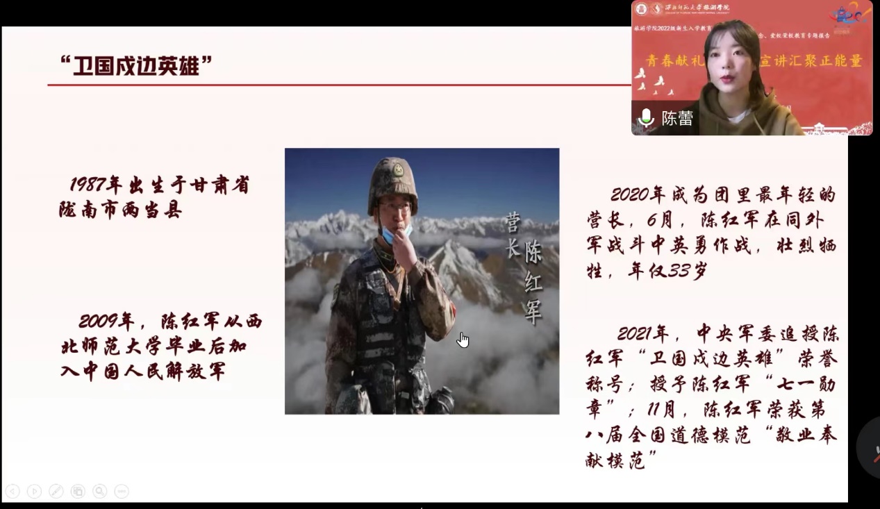 2021级航空服务艺术与管理一班学生陈蕾同学以“缅怀革命先烈,传承红色精神,卫国成边英雄校友陈红军烈士事迹宣讲”为主题,带领同学们一同学习缅怀校友陈红军烈士的英雄事迹。陈红军烈士于2009年从学校参军入伍,从一名战士成长为指挥官,奉献青春,保家卫国,用热血和生命捍卫了祖国的荣誉。这种戍边卫国、忠于职守、敢于斗争、不畏牺牲的爱国主义精神是师大学子学习的榜样,也是我们继续前行的动力。大家纷纷表示,要以陈红军烈士为榜样,在爱国主义的旗帜下,不断向前,奋力拼搏,为中华民族伟大复兴而不懈奋斗!”