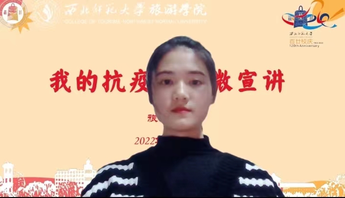 2020级航空服务艺术与管理1班豆玉翡同学以《疫路同行,共克艰难》为主题,分享了她作为beat365中文官网国旗班第十三届队员在疫情期间担任志愿者的难忘故事,她说:“在疫情下医护人员英勇无畏,舍小家、顾大家的伟大抗疫精神深深地打动了她的内心。”因此,作为国旗班的队员,她始终坚守国旗班的初心,克服重重困难,通过线上视频打卡的方式不断训练,夯实基本功,以便在志愿服务中贡献自己的力量。最后,她深情的表达了对疫情防控一线人员的敬意,呼吁大家向榜样学习,向模范致敬。