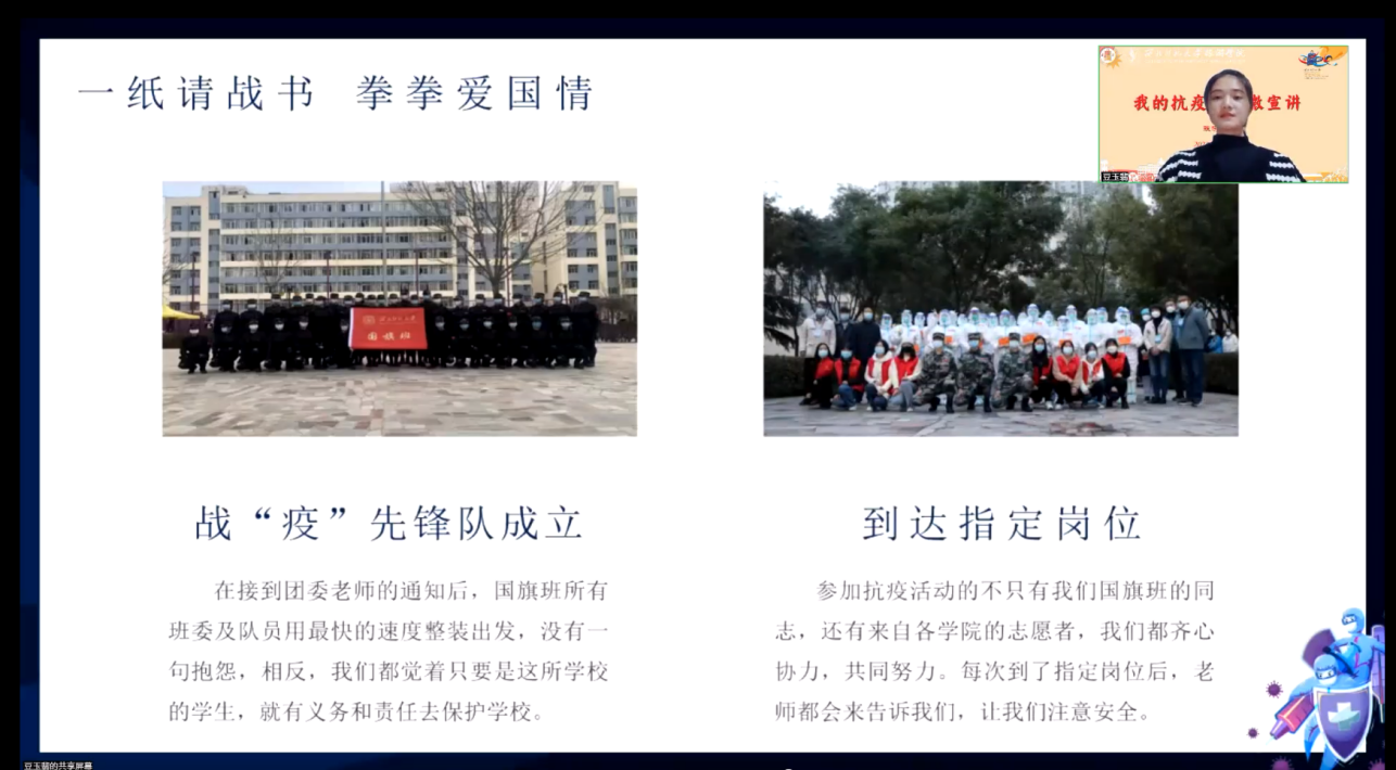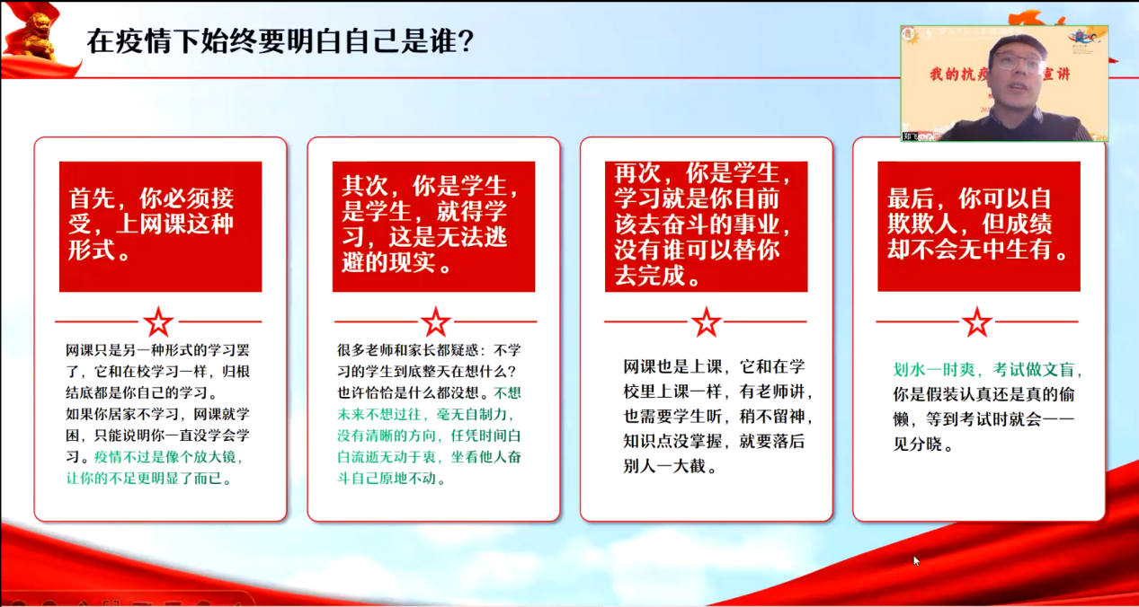 疫情当前,吾辈当自强;抗击疫情,青年勇担当。整个宣讲活动增强了同学们对抗疫的信心,点燃了对志愿工作的热情,参会同学积极连麦互动,纷纷表示在疫情面前没有旁观者,大家都是责任人,我们一定要共克时艰,同舟共济,努力做时代变局的清醒者、奉献者、奋斗者,用心书写共抗疫情、共同奋斗的青春之歌。