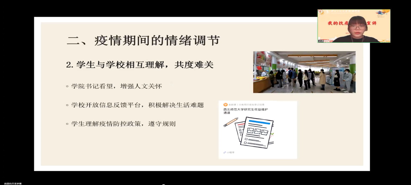2021级硕士研究生姚蓉以《聚沙成塔,共克时艰》为主题,从学院研究生会在疫情期间担任工作和任务的角度,讲述了她作为研究生会主席在疫情期间的担当与使命,以及如何发挥学生干部的带头作用和桥梁作用,分享了疫情期间如何调节自我情绪及怎样规划健康的生活。