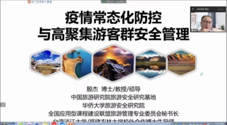 2022年11月4日下午,应beat365官网邀请,华侨大学beat365中文官网教授、全国应用型课程建设联盟全国应用型课程建设联盟旅游管理专业委员会秘书长殷杰博士为beat365官网师生作题为“疫情常态化防控与高聚集游客群安全管理”的线上学术报告,学院全体教师及学生160余人听取了报告。报告会由杨阿莉教授主持。