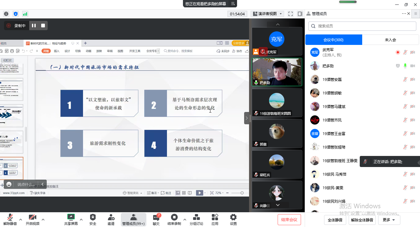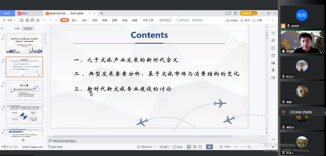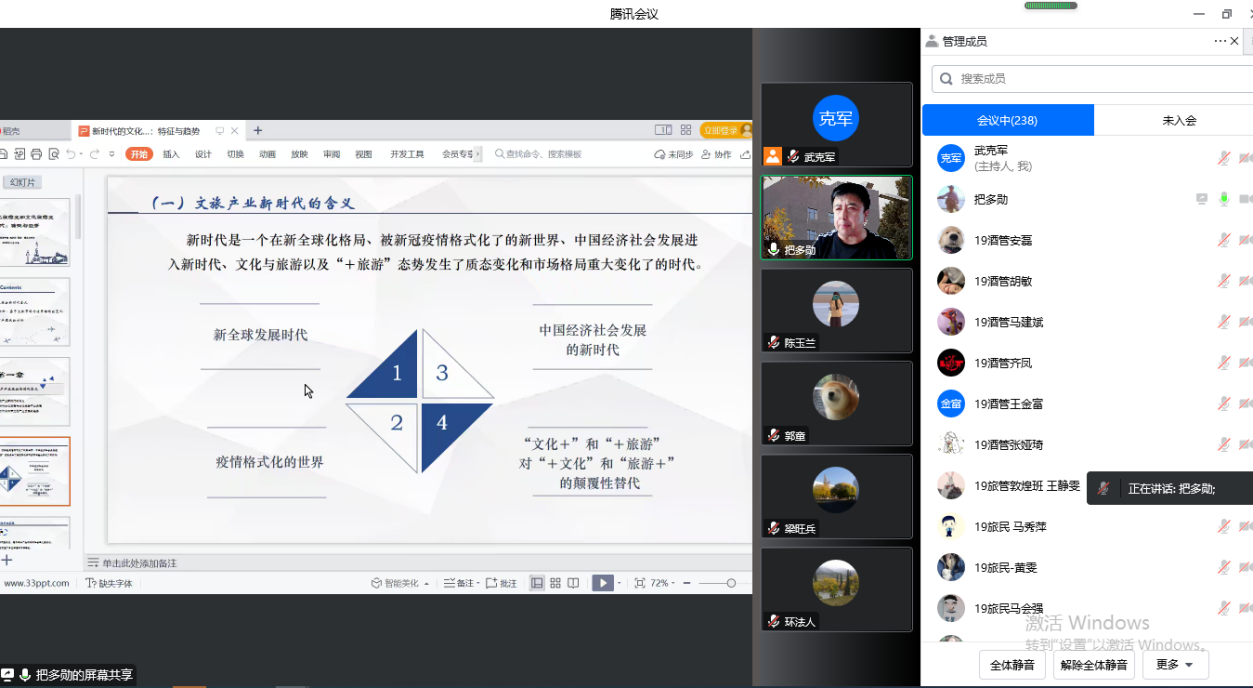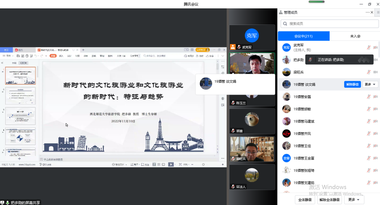 2022年11月10日下午,把多勋教授在线为beat365官网师生做《新时代的文化旅游业和文化旅游业的新时代:特征与趋势》的学术报告。报告由梁旺兵院长主持,beat365中文官网全院300多名师生参加了学习。