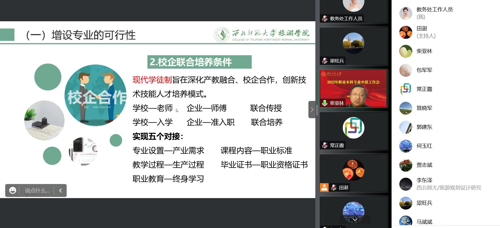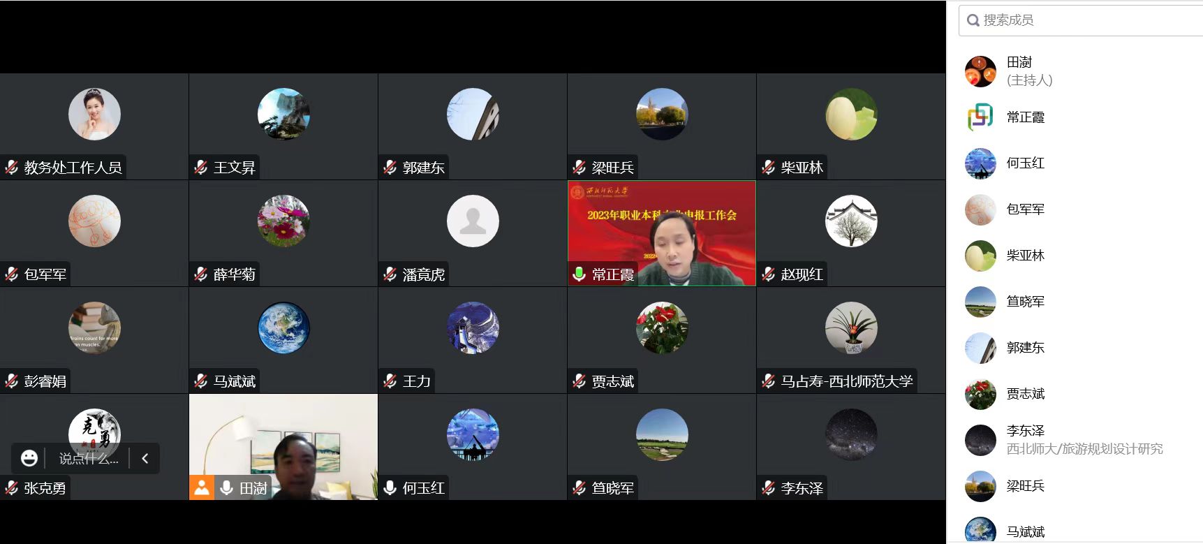 2022年12月12日至13日,普通本科学校试办职业本科旅游规划与设计专业设置论证会在线上顺利召开。副校长田澍教授主持会议,校外评审专家河南财经政法大学旅游与会展学院院长赵现红教授、青海师范大学经济管理学院副院长薛华菊教授、中国城市发展研究院有限公司西北研究院院长笪晓军正高级经济师以及校内评审专家教务处处长何玉红教授、人事处王文昇处长、招生就业处郭建东处长、发展规划与学科建设处张克勇处长、国有资产管理处贾志斌处长、继续教育学院常正霞院长参加评审,教务处副处长潘竟虎教授、beat365中文官网院长梁旺兵教授、继续教育学院马占寿副院长、财务处刘纪良科长与赵玲主任等列席会议,beat365中文官网副院长柴亚林副教授汇报专业设置情况。